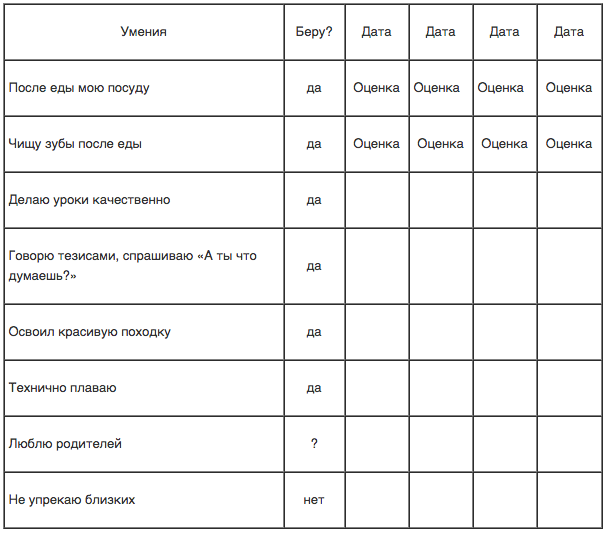 Навыки могут самого разного плана: простые (помыть посуду) и достаточно сложные (красивое и техничное плавание), очень конкретные (научиться чистить картошку) и очень широкие (умею любить родителей). Список навыков вы можете регулярно пополнять тем, что стало актуально.